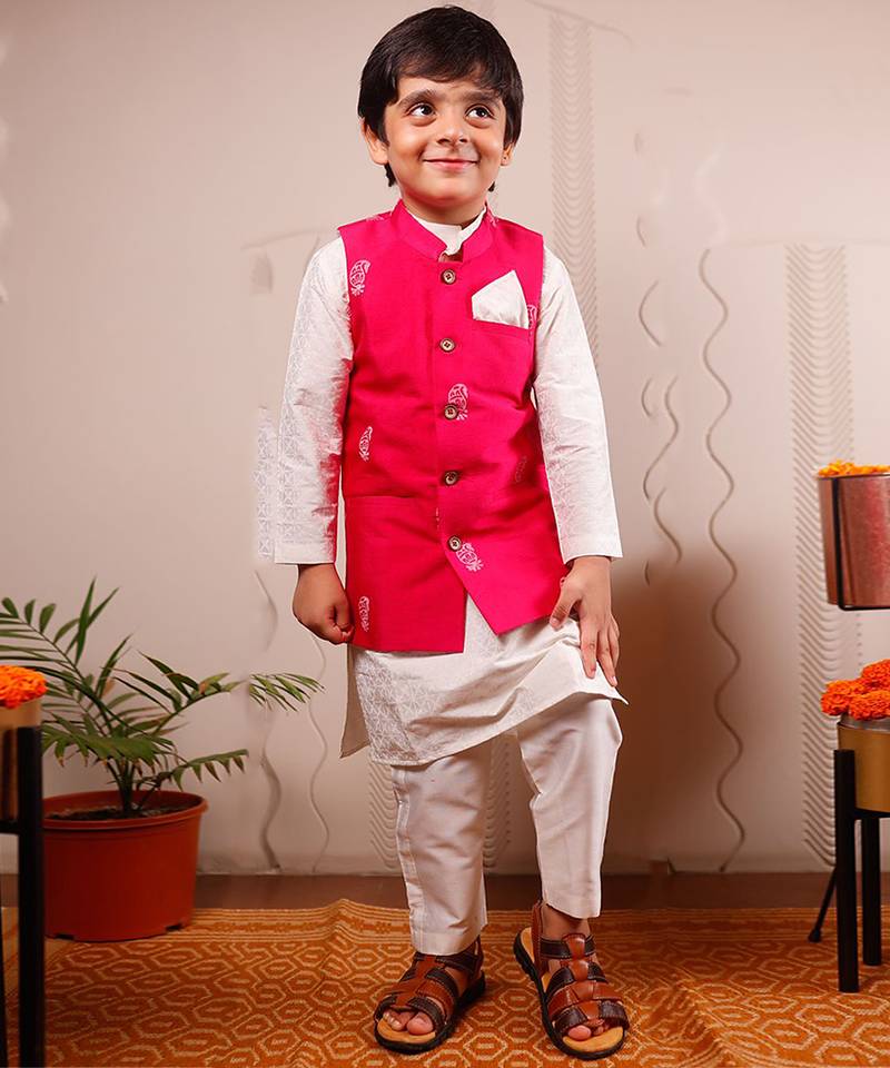 • Product Id : 4701974 • Package Details : 1 Kurta / 1 Pant / 1 Jacket • Type : Kids Nehru Jacket • Work : Printed • Look : Traditional • Sleeve : Full Sleeve • Top Color : Pink • Top Fabric : Cotton Silk • Stitching : Stitched • Gender : Boy Payments [+]