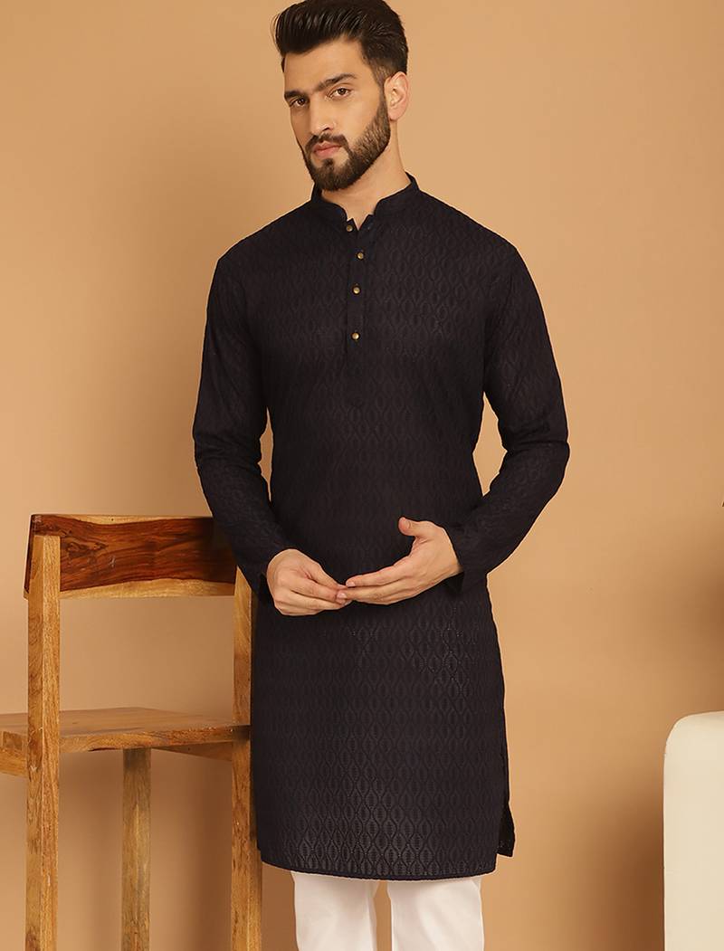 Black Chikankari Cotton Embroidery Men Kurta