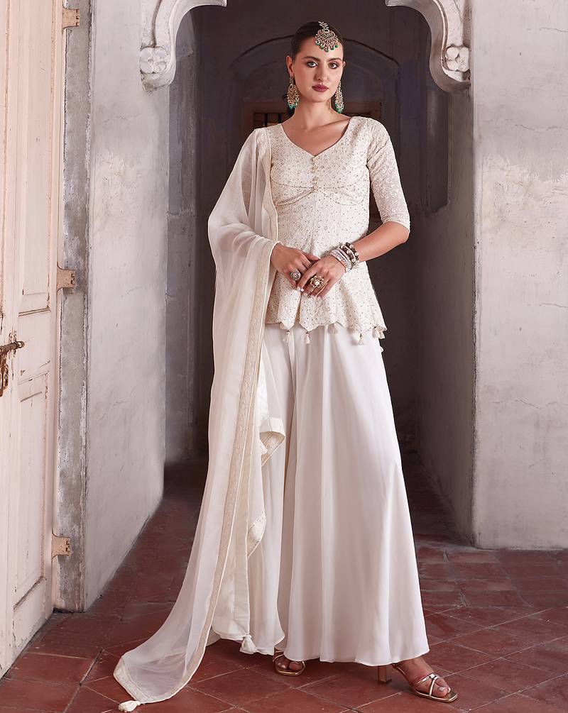 • Fabric : Georgette • Color : White • Style : Palazzo • Length : 40 In Dupatta Details