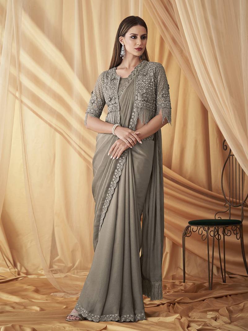 Grey Satin Embroidery With Sequence Work Saree With Unstitched Shrug And Blouse