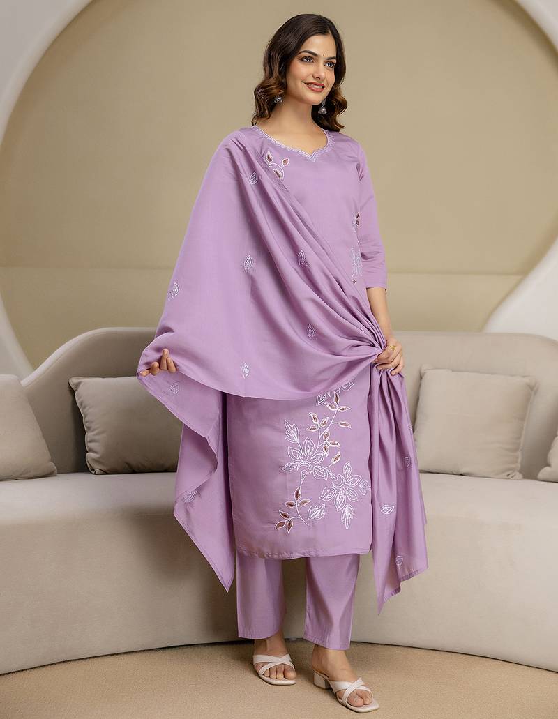 • Product Id : 4722575 • Package Details : 1 Top/1 Bottom/1 Dupatta • Type : Kurta Sets • Type : Thread Work • Look : Designer • Sleeve : Quarter Sleeve • Neck Style : Round Neck • Occasion : Formal • Fabric : Chanderi • Color : Light Purple • Work : Thread Embroidery • Stitching : Stitched Payments [+]