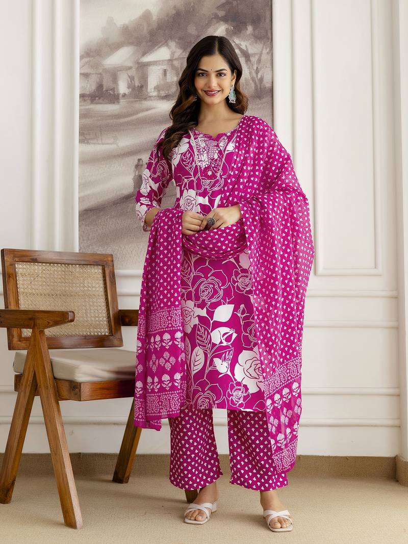 Pink Pure Cotton Floral Print Embroidery Work Anarkali Kurta Pant With Dupatta Stitched