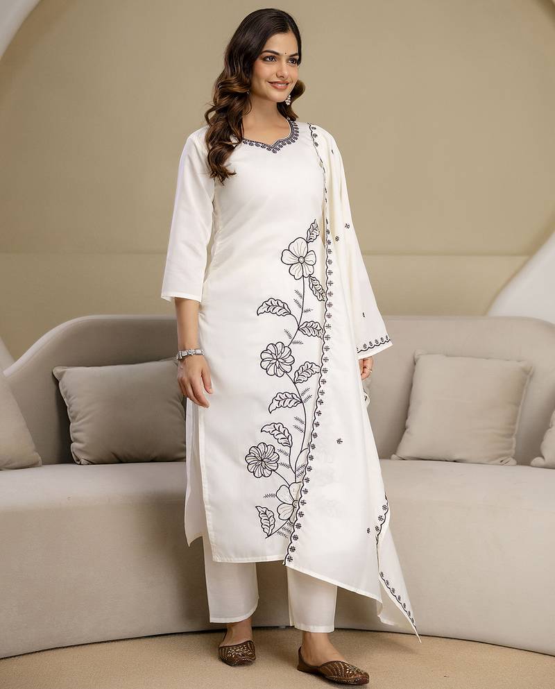 White Chanderi Cotton Embroidery Work Kurta Pant With Dupatta Set Stitched