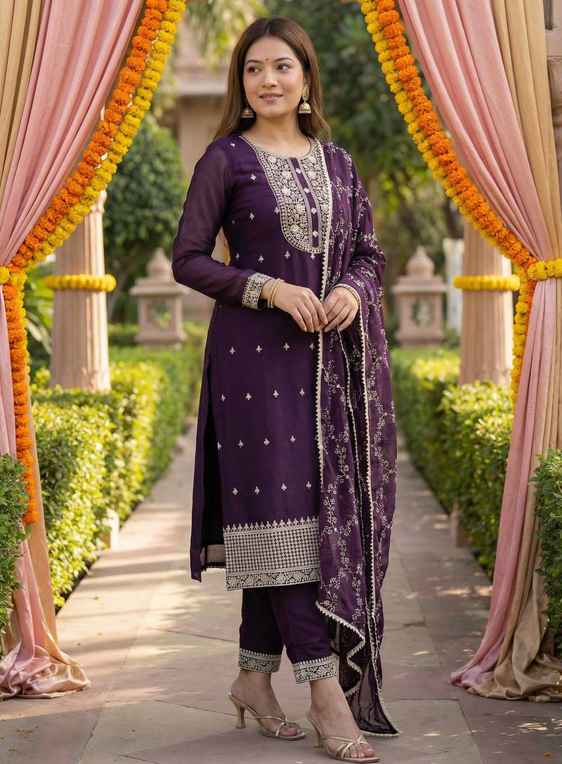 If you find the product for less we'll match it! Know MoreElegant Kurta Pant Set with Dupatta crafted in lightweight georgette fabric, offering a smooth texture with a graceful and flowy drape. The kurta is beautifully detailed with intricate thread embroidery on the neckline and borders, complemented by delicate butti motifs spread across the body for a refined ethnic look. Paired with straight-fit pants featuring coordinated border work for a balanced and polished appearance. Comes with a matching georgette dupatta adorned with fine embroidery and scalloped edging, adding a sophisticated and festive finish to the ensemble.