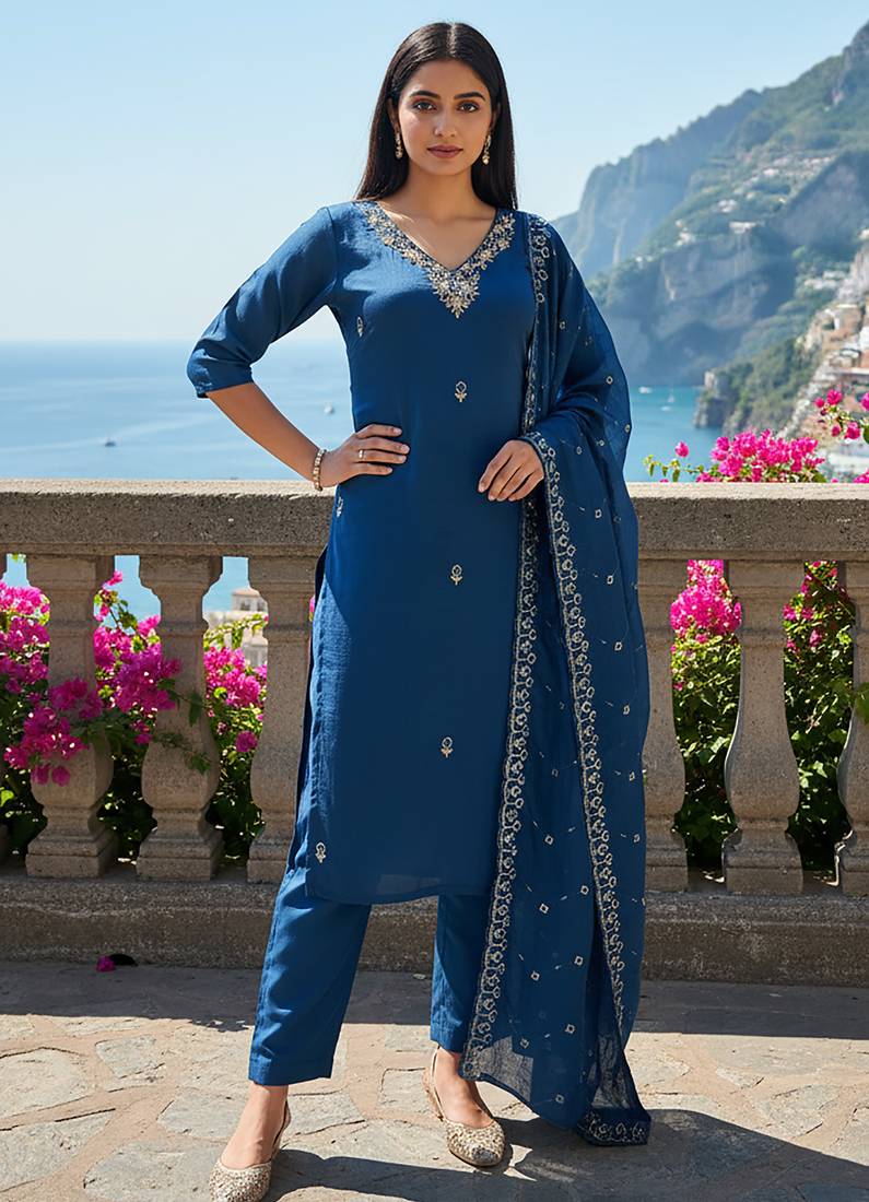 Grace your ethnic collection with this elegant dark blue kurta set, exuding subtle charm and sophistication. The soft-hued kurta features delicate sequin and thread embroidery around the neckline and scattered motifs throughout. Paired with straight-fit pants and a matching dupatta adorned with floral embroidery and shimmer work, this set is perfect for festive celebrations, pooja ceremonies, or elegant casual wear.