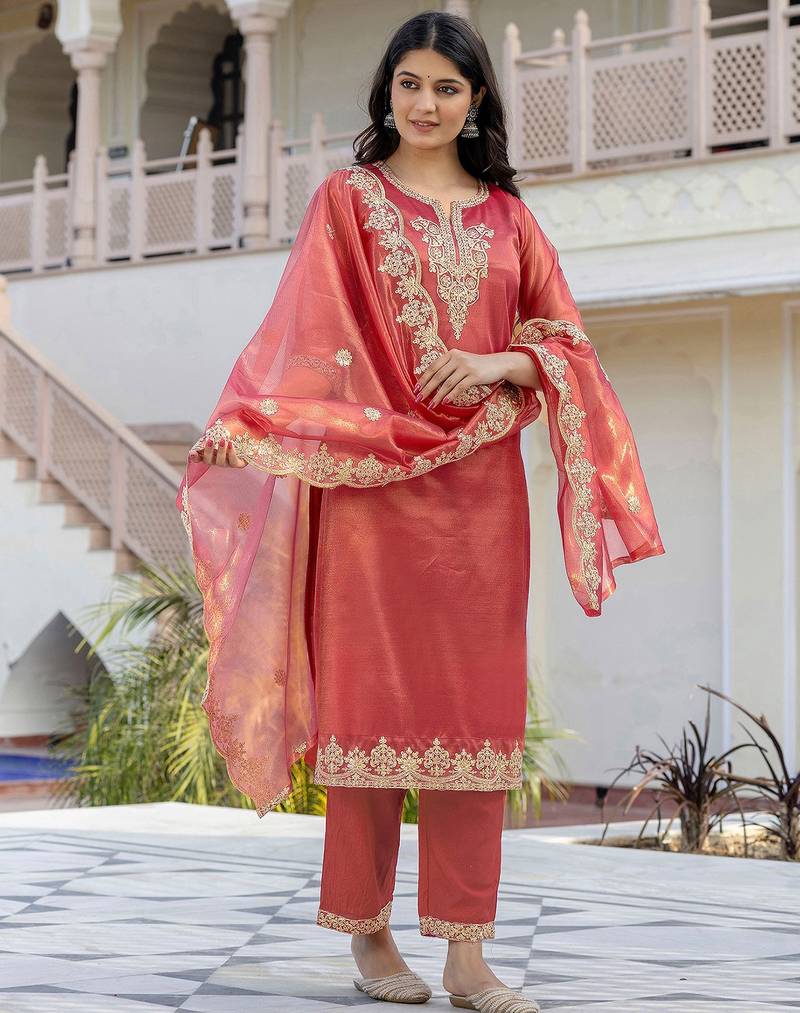 This elegant women’s Kurta Pant with Dupatta set features a beautifully crafted kurta in sheer net fabric, enhanced with intricate embroidery work that adds a rich festive charm. The kurta showcases delicate floral and traditional motifs with detailed border work on the neckline, sleeves, and hem, creating a graceful pattern flow. Paired with a solid micro silk pant, the set offers a balanced and refined silhouette. The matching net dupatta is adorned with embroidered border.