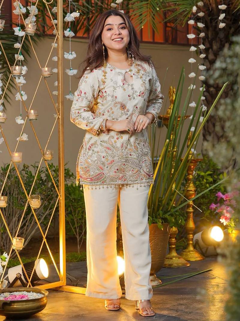 • Product Id : 4696432 • Package Details : 1 Top/1 Bottom • Type : Kurta Sets • Work : Embroidered • Type : Hand Embroidery • Look : Designer • Sleeve : Quarter Sleeve • Neck Style : Keyhole Neck Kameez • Color : Off White • Fabric : Pure Silk • Stitching : Stitched • Length : 33.0 • Side Slit : Yes Payments [+]