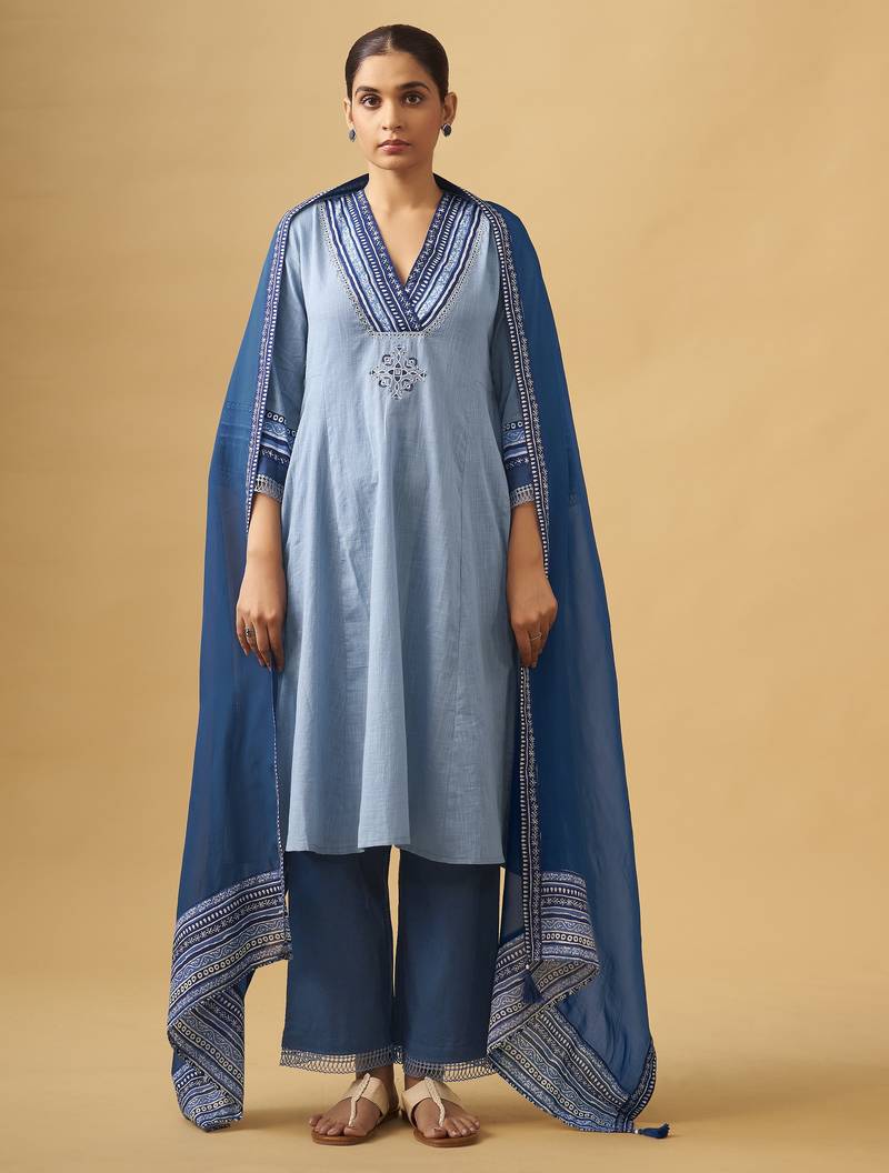 A timeless A-line kurta set crafted in soothing shades of blue, designed for effortless elegance. The kurta features intricate contrast embroidery along the neckline and sleeves, adding a refined handcrafted touch. Paired with straight-fit pants finished with subtle detailing at the hem, this set offers both comfort and sophistication. Ideal for daytime festivities, work wear, or relaxed celebrations, it blends traditional charm with modern simplicity.