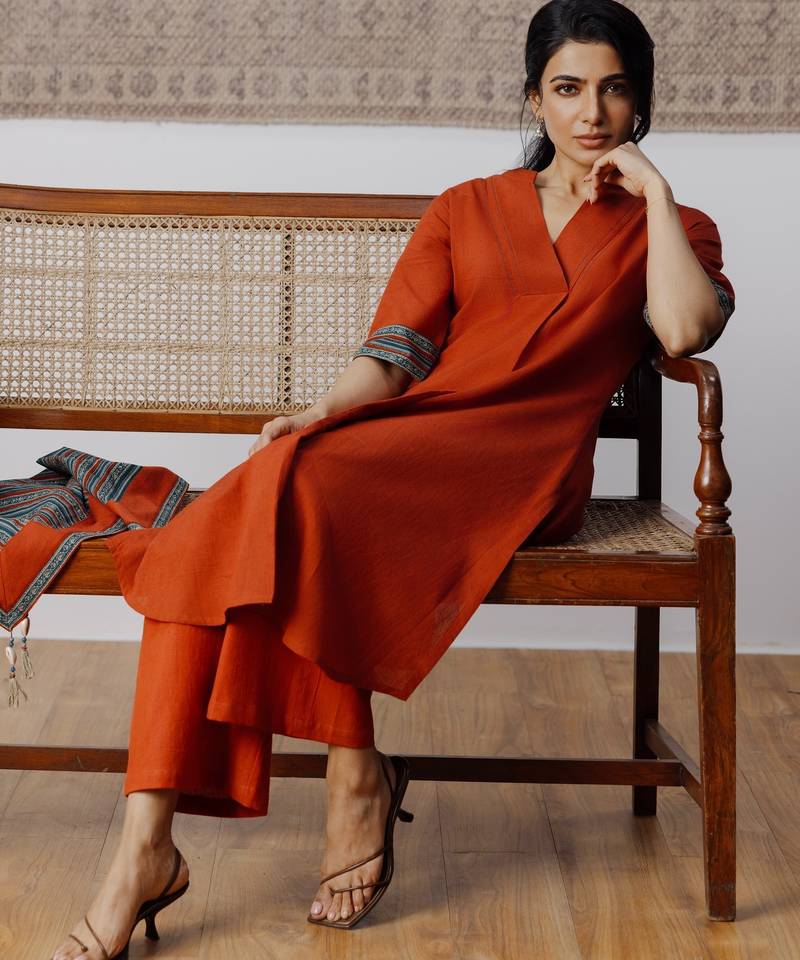 breathable cotton flex fabric kurta set offers a soft feel with added flexibility for enhanced comfort. The A-Line kurta features contrast woven borders along the neckline and sleeves, paired with a coordinated scarf finished with handcrafted tassels. Matched with relaxed straight-fit pants, this set is designed for effortless everyday elegance and ease of movement.