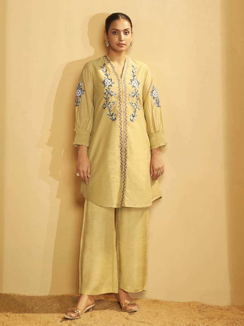Brighten your wardrobe with Yellow Floral Embroidered shirt, featuring intricate blue thread embroidery on a breathable cotton base. The V-neck kurta with gathered sleeves pairs beautifully with straight-fit pants, offering both comfort and grace. Ideal for festive brunches, day celebrations, or elegant everyday dressing