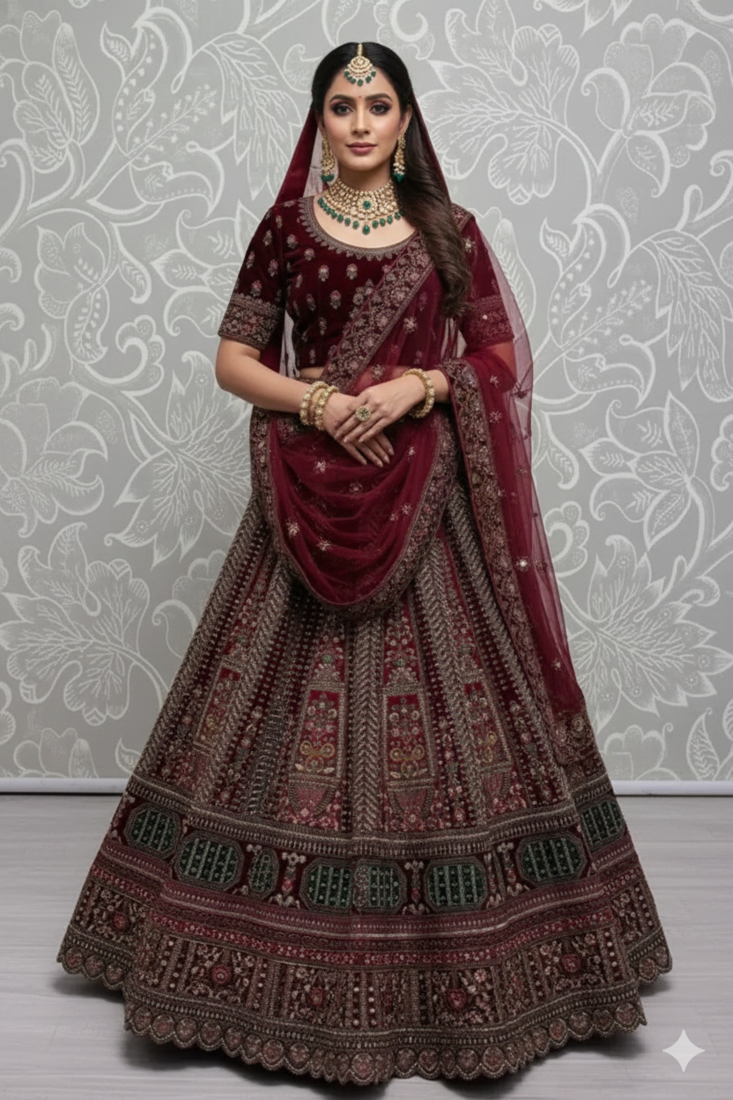 The semi-stitched design allows for a tailored fit while maintaining traditional aesthetics and luxurious flair. Its rich velvet texture and meticulous craftsmanship embody opulence and grace for the modern bride.