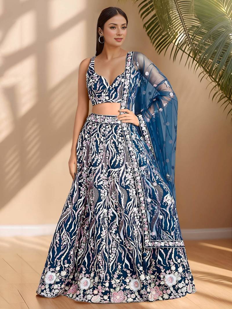 This blue lehenga set is crafted from fine net fabric with a lehenga length of 42 inches and a graceful 3.50-meter flair. The intricate floral embroidery in pastel shades with sequins enhances its elegance, making it perfect for festive and wedding occasions.