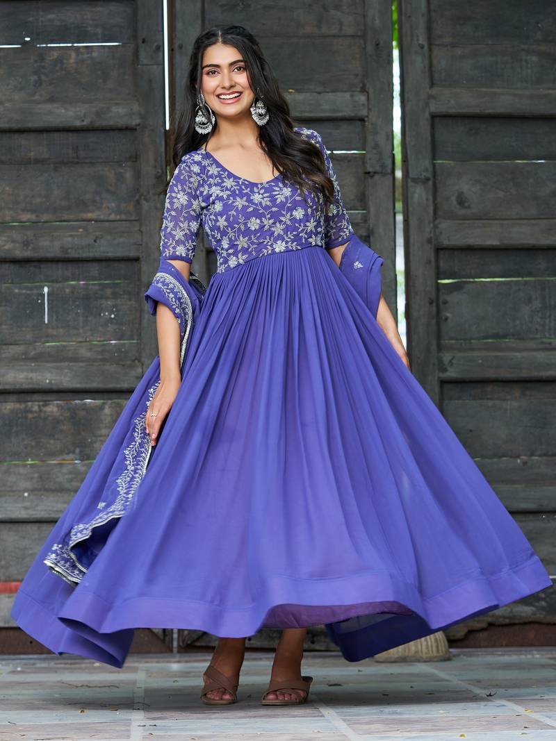 • Product Id : 4714413 • Package Details : 1 Gown / 1 Dupatta • Type : Anarkali Suit • Occasion : Festive • Work : Embroidered • Type : Beads • Look : Traditional • Sleeve : Elbow Sleeve • Neck Style : Round Neck • Fabric : Georgette • Color : Blue • Stitching : Stitched • Min Bustsize Fit : 38 • Max Bustsize Fit : 44 Payments [+]