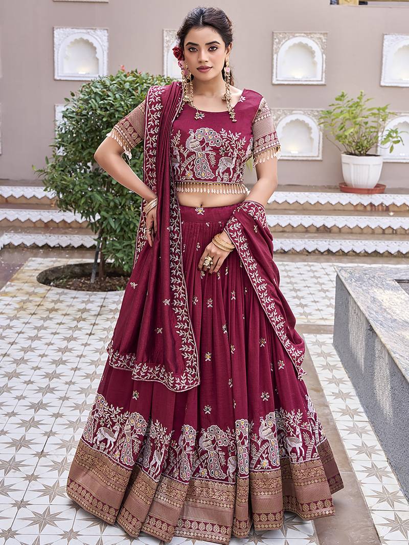 This elegant lehenga choli set is crafted from premium vichitra silk fabric with rich embroidery and sequin work. A perfect blend of comfort and royal style for special occasions.