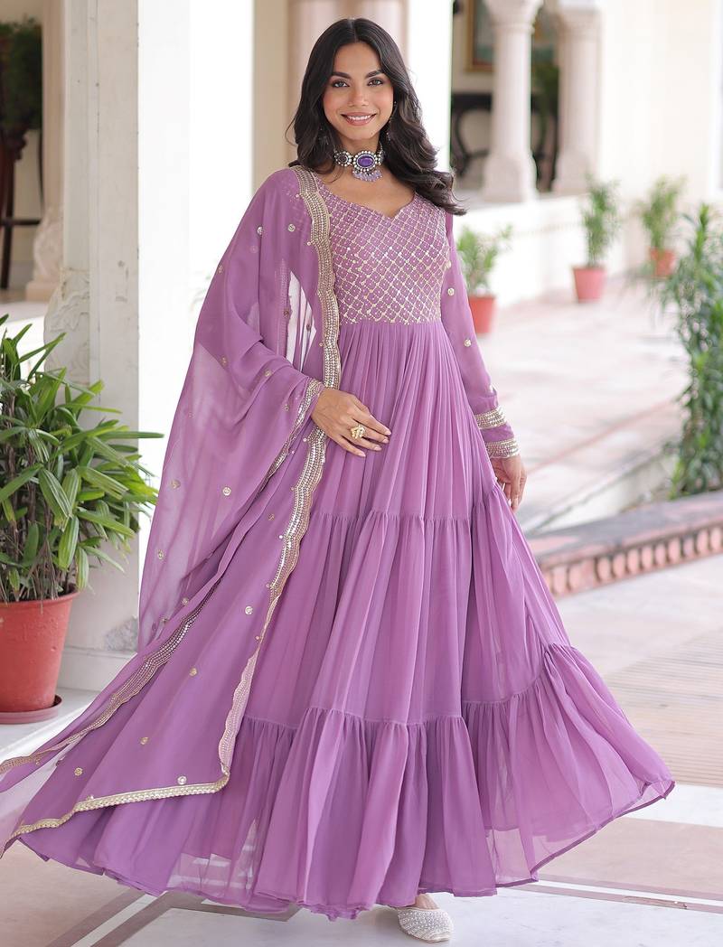 This graceful purplegeorgette gown set defines sophistication with its rich zari and sequins embroidered bodice. The perfectly tailored V neckline and full sleeves add a regal touch, while the layered frill design enhances the overall flow and femininity of the outfit.