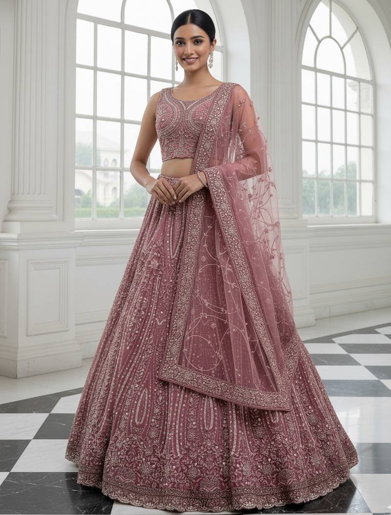 This stunning lehenga set is crafted in premium net fabric, showcasing a rich and elegant look. The soft pink tone enhances the charm and gives a graceful wedding-wear appeal.