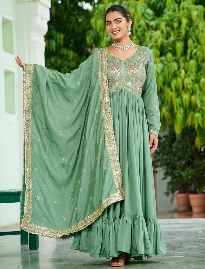 Elegant Green Floral Embroidered Silk Flared Gown With Dupatta Stitched