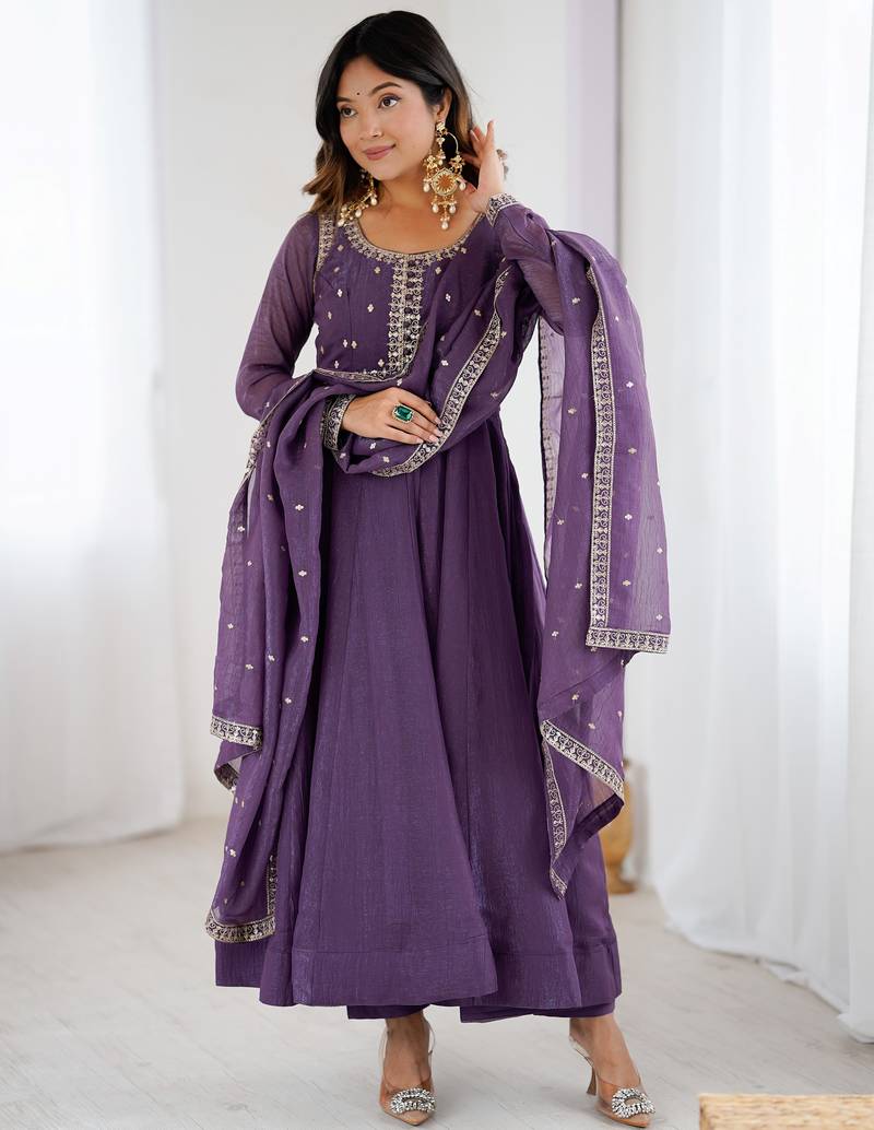Purple Sequins Silk Anarkali Gown With Dupatta Stitched