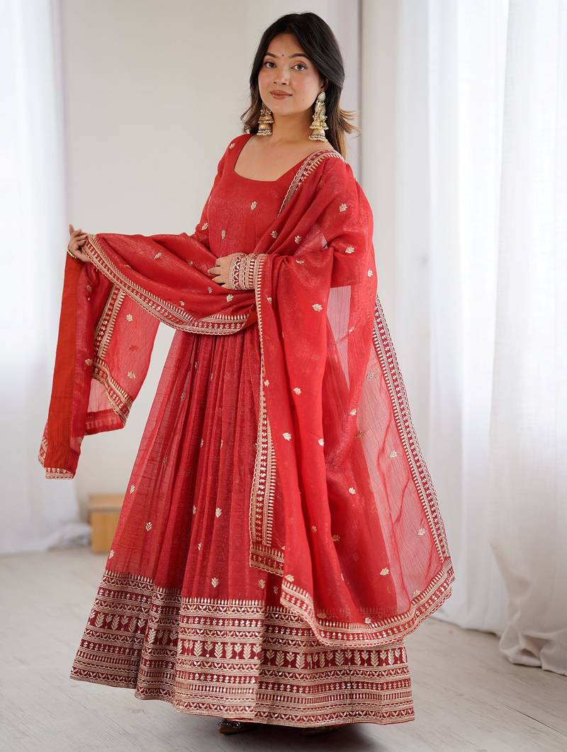 Red Embroidered Silk Festive Wear Gown With Dupatta Stitched