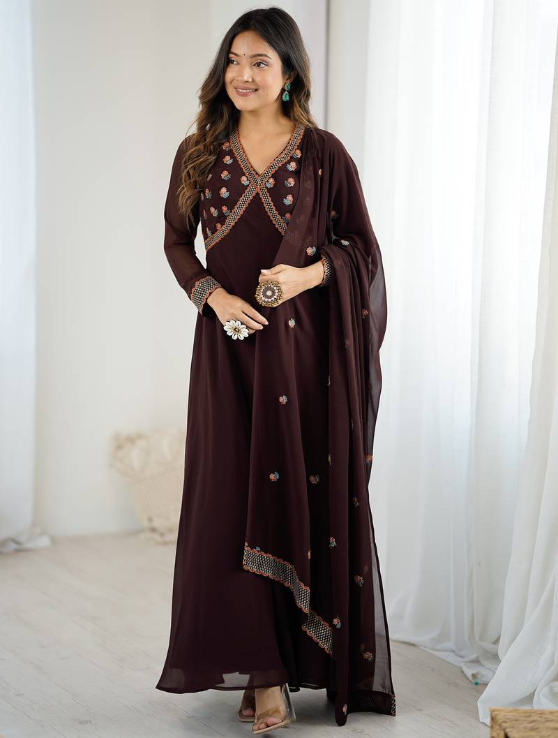 This elegant outfit in rich brown showcases a timeless design with delicate embroidery work. Made from premium georgette fabric, it flows gracefully and offers a regal look.