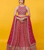 The lehenga is made of red georgette material, adorned with stunning sequins, delicate embroidery work, and intricate zari work.