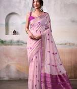 This graceful pink cotton saree with purple woven motifs is a celebration of color and tradition. Crafted in cotton with a length of 5.5 meters, it drapes with ease and elegance.