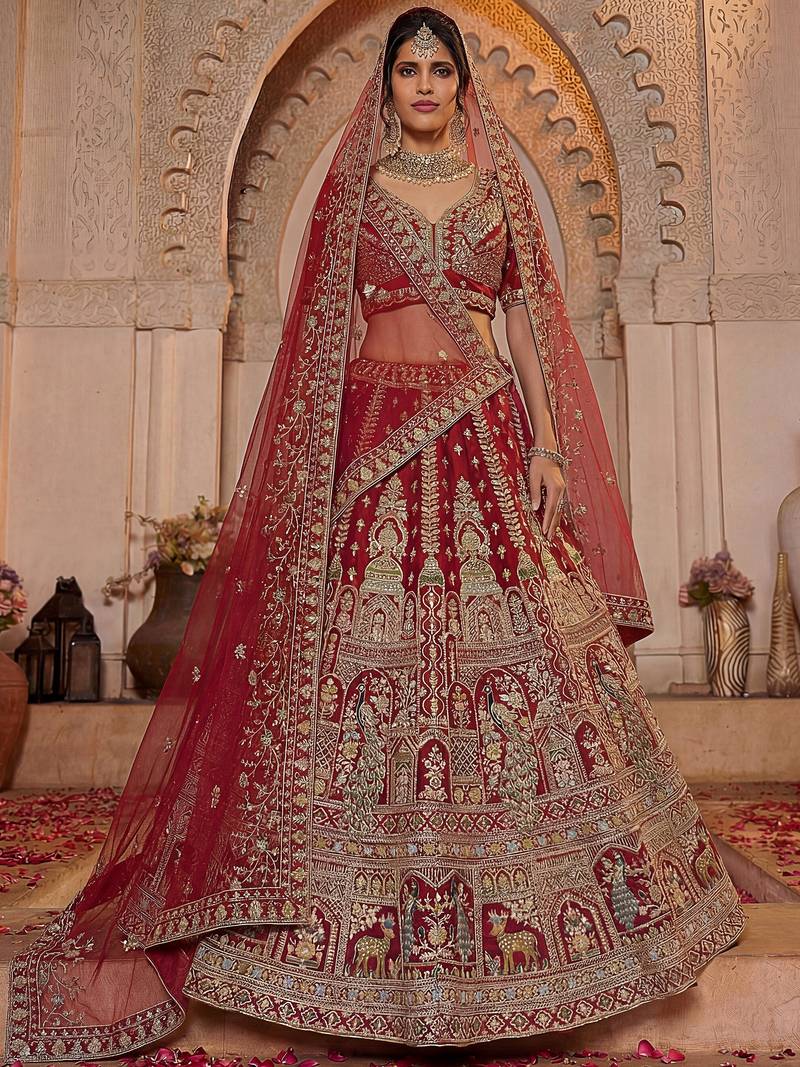 The classic combination of deep red and rich gold tones creates a royal bridal palette, making this lehenga choli perfect for weddings, bridal wear, receptions, and grand festive occasions.
