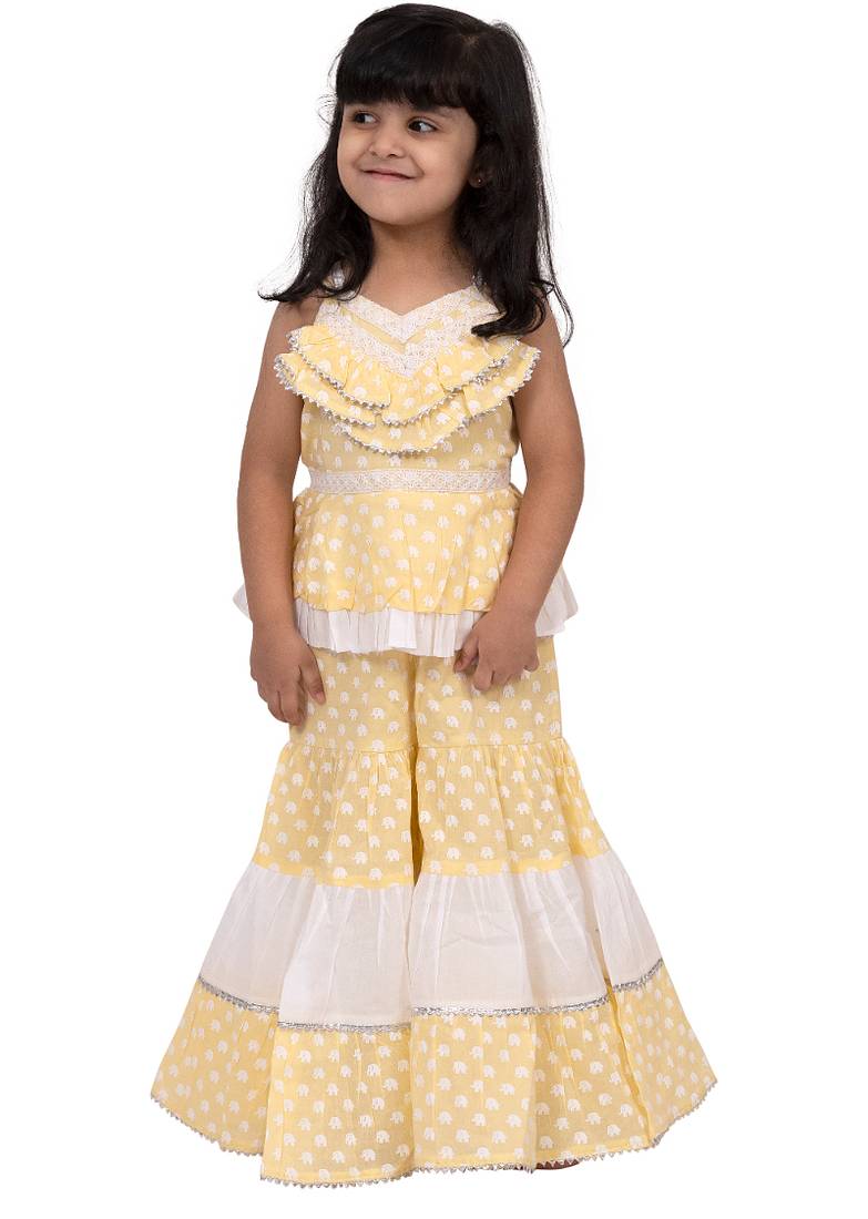 Cotton Sleeveless Elephant Printed Top With Sharara Yellow & White