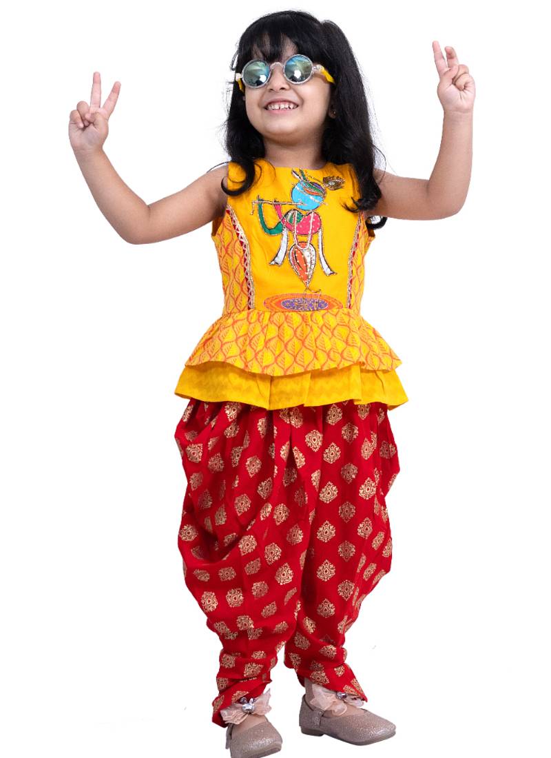 Cotton Sleeveless Krishna Printed Top & Dhoti Yellow & Red