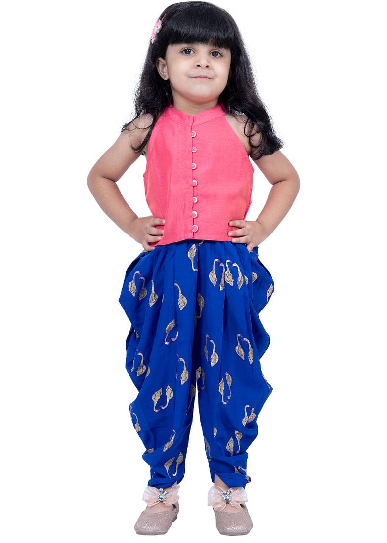 • Product Id : 4694330 • Package Details : 1 Top, 1 Dhoti • Type : Indo Western Dress For Girls • Work : Plain • Look : Fashion • Sleeve : Sleeveless • Neck Style : Chinese Collar Kameez • Bottom Fabric : Polyester • Bottom Color : Blue • Top Color : Pink • Top Fabric : Chanderi • Bottom Style : Dhoti • Stitching : Stitched • Gender : Girl Payments [+]