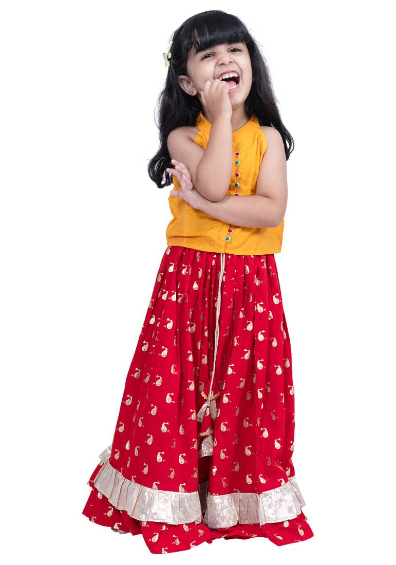 • Product Id : 4694220 • Package Details : 1 Top, 1 Lehenga • Type : Kids Lehenga Choli • Work : Plain • Look : Fashion • Sleeve : Sleeveless • Neck Style : Round Neck • Bottom Fabric : Polyester • Bottom Color : Red • Top Color : Yellow • Top Fabric : Polyester • Stitching : Stitched • Gender : Girl Payments [+]