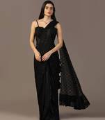Make A Bold And Sophisticated Statement In This Stunning Black Embroidered Corset Saree. The Blouse Is Adorned With Intricate Cutdana, Sequin, And Pearl Embroidery, Creating A Luxurious Texture That Catches The Light With Every Movement. The Saree Itself Drapes Gracefully, Making It Perfect For Every Events, Weddings, Or Any Occasion Where You Want To Shine With Poise And Confidence.
