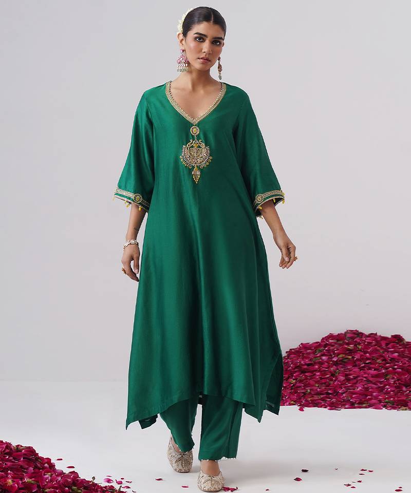 Green Embroidered Chanderi Silk Kurta Set