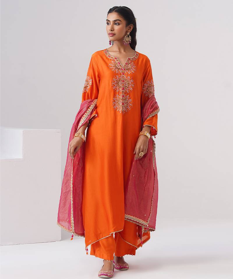 Orange Embroidered Chanderi Silk Kurta Set