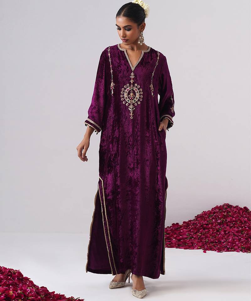This Purple Embroidered Velvet Kaftan Exudes Luxurious Elegance And Timeless Sophistication. Crafted From Rich, Soft Velvet, It Features Intricate Embroidery That Adds A Regal, Refined Touch. Perfect For Evening Gatherings And Festive Occasions, It Offers A Graceful Flow, Comfortable Fit, And Effortlessly Glamorous Appeal.