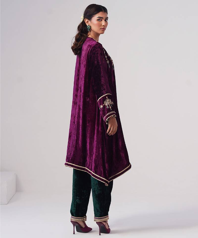This Purple Embroidered Velvet Kaftan Exudes Luxurious Elegance And Timeless Sophistication. Crafted From Rich, Soft Velvet, It Features Intricate Embroidery That Adds A Regal, Refined Touch. Perfect For Evening Gatherings And Festive Occasions, It Offers A Graceful Flow, Comfortable Fit, And Effortlessly Glamorous Appeal.