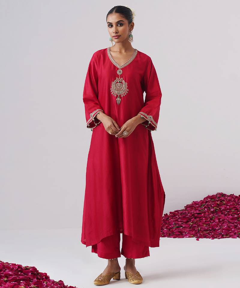 This Red Embroidered Chanderi Silk Kurta Set Radiates Festive Elegance And Graceful Charm. Crafted From Lightweight, Lustrous Chanderi Silk, It Features Intricate Embroidery That Adds A Refined, Traditional Touch. Perfect For Celebrations And Special Occasions, It Offers Comfort, A Flattering Silhouette, And Timeless Ethnic Appeal.