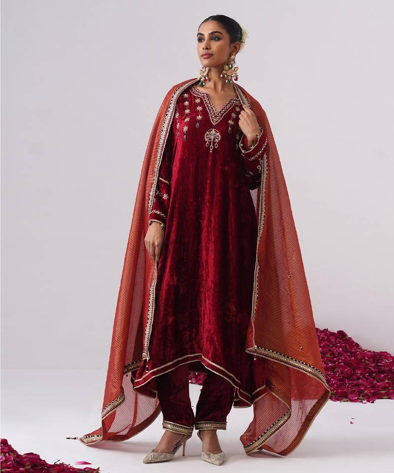 Red Embroidered Velvet Kurta Set