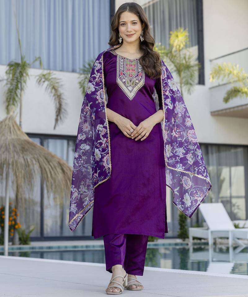 Make a bold and timeless statement with this striking Purple kurta set, beautifully accented with intricate embroidery for a rich and elegant ethnic look. The kurta features detailed threadwork on the neckline, sleeves, and hem, showcasing traditional motifs that add depth and sophistication to the outfit. The straight silhouette ensures a flattering fit while maintaining comfort and ease of movement.Crafted from soft and breathable fabric, this ensemble is designed for both style and all-day wearability. The coordinated bottoms feature matching embroidery that enhances the overall look, while the lightweight dupatta with subtle detailing completes the outfit with graceful finesse. The dramatic contrast of black and red creates a powerful yet refined aesthetic, perfect for festive occasions, evening gatherings, cultural events, and celebrations.