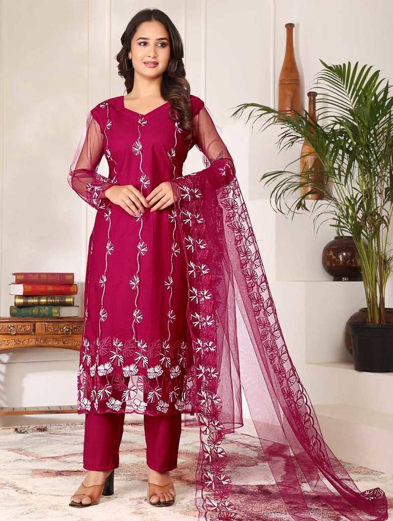 • Product Id : 4695371 • Package Details : 1 Kurta/1 Palazzo / 1 Dupatta • Type : Kurta Sets • Region : All • Fabric : Net • Work : Embroidered • Type : Thread Work • Look : Traditional • Sleeve : Quarter Sleeve • Neck Style : V Neck • Color : Rani Pink • Stitching : Stitched • Length : 44.0 • Side Slit : Yes Payments [+]