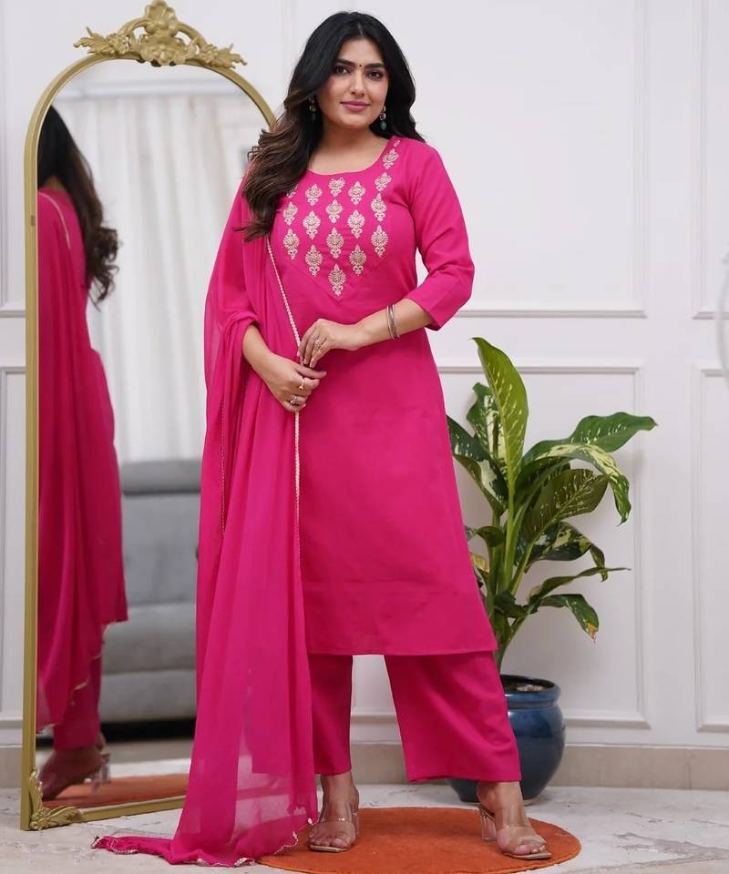 Add a touch of timeless elegance to your ethnic wardrobe with this stunning fuchsia pink embroidered kurta set, designed to balance simplicity and festive charm. Crafted from a soft, breathable fabric, the kurta features delicate gold thread floral embroidery on the yoke, creating a rich yet understated look that never goes out of style.The solid silhouette keeps the ensemble graceful and versatile, while the lightweight matching dupatta adds fluid movement and completes the ethnic appeal. Paired with coordinated bottoms, this kurta set is perfect for women who appreciate classic design with a modern finish.Ideal for festive celebrations, wedding functions, pooja ceremonies, family gatherings, and elegant day wear, this set can be styled effortlessly with statement earrings and heels or flats for a polished ethnic look.