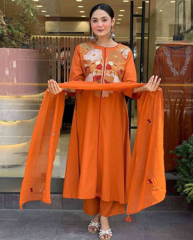 Bring home a statement of earthy elegance with this Burnt Orange Embroidered Kurta Set, designed to blend artistic craftsmanship with contemporary ethnic styling. Crafted for festive occasions, cultural gatherings, office festivities, and elegant day functions, this outfit offers a perfect balance of comfort and sophistication.The kurta features a graceful A-line silhouette with a front-open style, giving it a modern yet traditional appeal. The kurta is the bold floral embroidery on the yoke, showcasing intricate thread embroidery in contrasting hues. The floral motifs are thoughtfully arranged in a symmetrical pattern, creating a striking visual impact while maintaining elegance.The embroidery work extends neatly across the upper front panel, enhanced with fine detailing and precision stitching, reflecting premium craftsmanship. The kurta body is kept solid in a rich burnt orange shade, allowing the embroidered work to stand out beautifully. The sleeves are styled with a clean, minimal finish, adding to the refined and contemporary look.