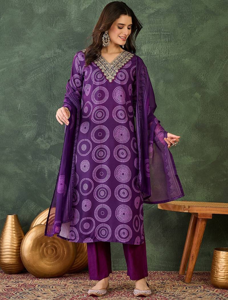 Bring home timeless ethnic charm with this Purple Printed Kurta Set, designed for women who love elegant prints with subtle traditional detailing. This beautifully crafted kurta set reflects a perfect balance of heritage-inspired patterns and contemporary styling, making it ideal for festive occasions, office wear, casual outings, and family gatherings.The kurta showcases an all-over circular motif print created with fine dotted work, inspired by traditional Indian art forms such as Bandhani and mandala-style designs. These evenly spaced round motifs create a rhythmic and harmonious visual appeal across the fabric. The neckline is enhanced with decorative printed detailing and intricate yoke-style patterning, adding a touch of richness and sophistication to the overall look.The kurta is paired with a matching lightweight dupatta featuring coordinated dotted and circular patterns, maintaining uniformity while adding fluidity and grace. The soft, sheer texture of the dupatta allows for an elegant drape, elevating the outfit’s ethnic appeal without overwhelming the design.Complementing the printed kurta is a pair of straight-fit pants, which balance the detailed prints perfectly. The solid bottom adds structure and keeps the look refined, making the outfit suitable for both everyday wear and special occasions.