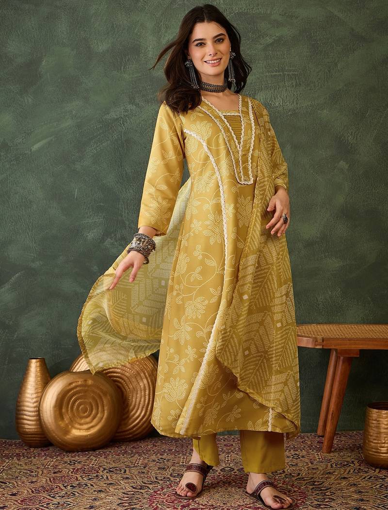Add a touch of effortless elegance to your ethnic collection with this Mustard Yellow Printed Kurta Set, thoughtfully designed for women who appreciate subtle craftsmanship and graceful patterns. This kurta set beautifully blends traditional Indian print techniques with a modern silhouette, making it an ideal choice for daily wear, office wear, festive gatherings, and casual ethnic outings.The kurta features intricate all-over floral vine motifs created using fine dotted print work, inspired by classic Indian block and Bandhani-style artistry. The delicate floral pattern flows seamlessly across the fabric, giving the kurta a soft and refined look. The front panel and neckline are highlighted with vertical printed detailing and lace-style accents, adding depth and elegance while enhancing the overall structure of the outfit.The ensemble is completed with a matching printed dupatta showcasing geometric and diagonal dotted patterns. This contrast between floral motifs on the kurta and geometric patterns on the dupatta creates a visually rich yet balanced appearance. The lightweight dupatta drapes gracefully, adding movement and sophistication to the look.Paired with straight-fit pants, the kurta set maintains a clean and well-coordinated finish. The solid bottom complements the detailed prints, ensuring the outfit looks elegant without appearing overwhelming.