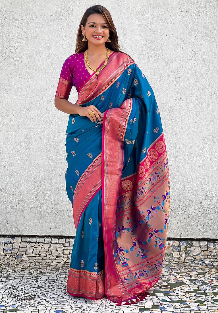 Blue Woven Self Design Pure Silk Paithani Saree With Blouse