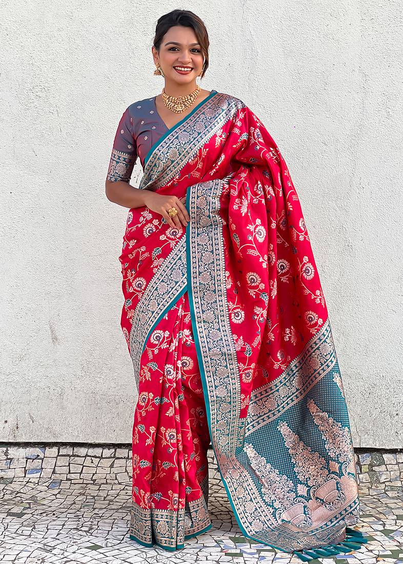• Saree : Color- Pink / Fabric- Pure Silk • Blouse : Color- Teal / Fabric- Silk Blend Saree Details