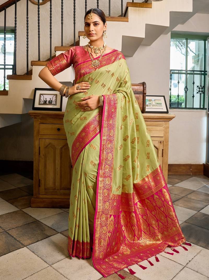 • Saree : Color- Light Green / Fabric- Silk Blend • Blouse : Color- Dark Pink / Fabric- Paithani Silk Saree Details