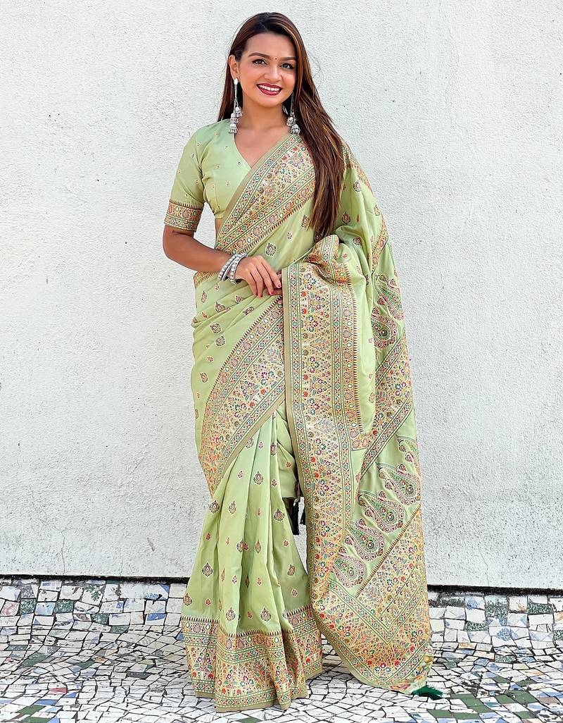 Pista Green Woven Self Design Pashmina Silk Saree With Blouse