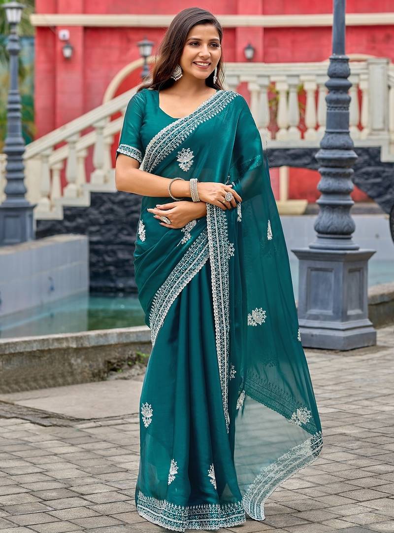 Teal Blue Embroidered Embellished Shimmer Chiffon Bollywood Saree With Blouse