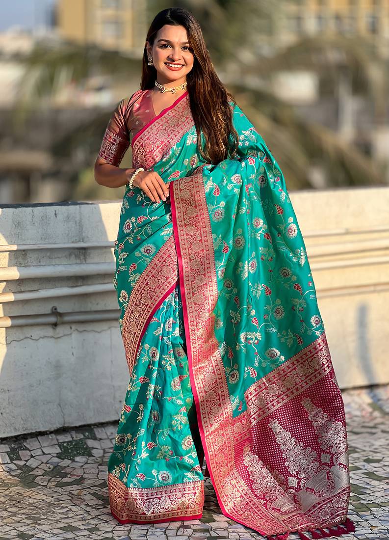 Teal Green Woven Self Design Pure Silk Banarasi Saree With Blouse